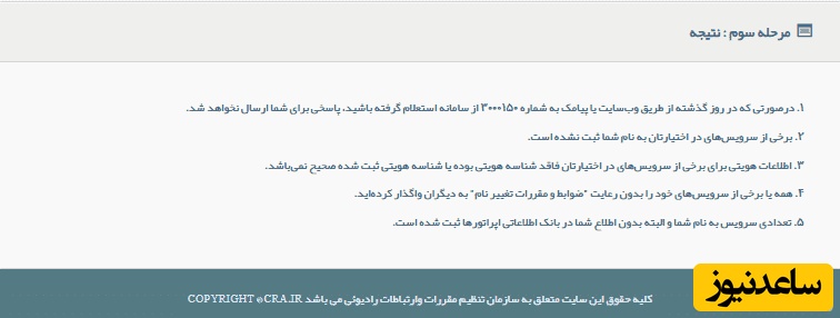 4- پس از تکمیل اطلاعات پیامک تعداد سیم کارت های ثبت شده به نام شما از طریق پیامک با نام CRA.ir برای شما ارسال خواهد شد. در صورت عدم دریافت پیامک و یا وجود هرگونه مغایرت به دلایل زیر برای رفع مشکل به اپراتورهای مربوطه مراجعه نمایید.