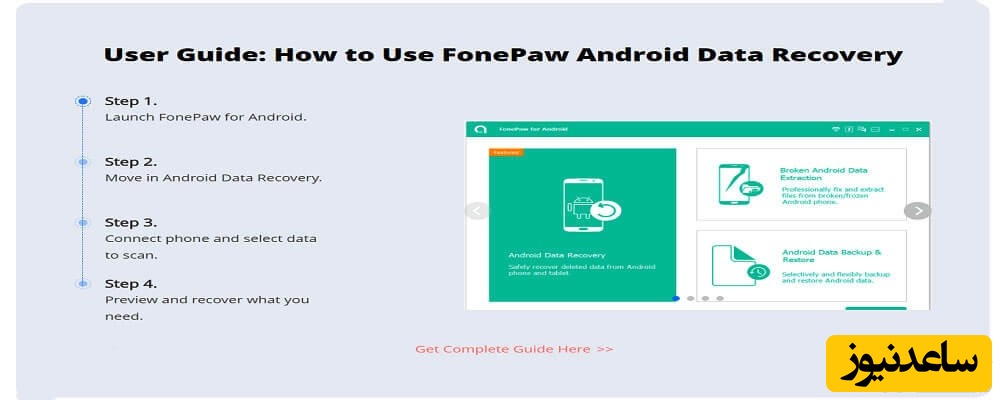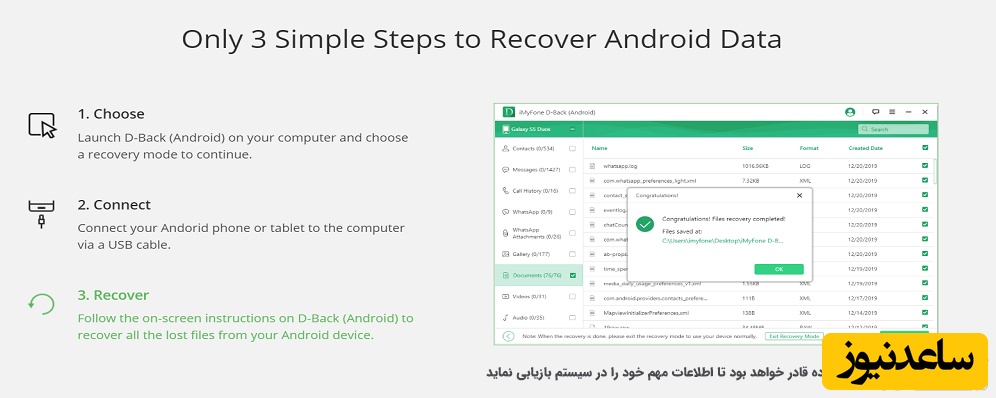 نرم افزاری بسیار آسان در هنگام استفاده و دارای رابط کاربری بسیار عالی است. این برنامه می تواند به طور موثر فایل های حذف شده شما را مانند مخاطبین ، پیام های متنی ، فیلم ها ، عکس ها ، اسناد و صدا را بازیابی کند. از این اپلیکیشن بیش از 6000 دستگاه اندرویدی از جمله سامسونگ ، ال جی ، HTC ، سونی ، وان پلاس و غیره پشتیبانی می کنند.