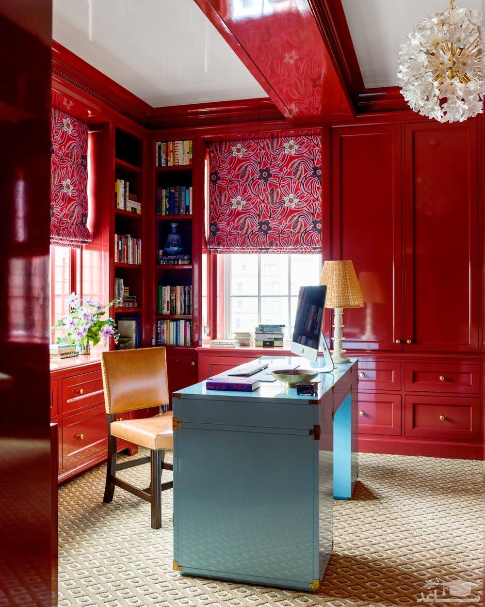 قرمز یکی از رنگ های دوست داشتنی برای بسیاری از انسان ها است. با این وجود تعداد کمی از آنها قرمز را به عنوان رنگ اتاق کار منزل خود انتخاب می کنند. قرمز رنگی است که باعث ایجاد هیجان و افزایش گرش خون می شود. از طرف دیگر این رنگ گاهی باعث افزایش خشونت نیز می شود. در ادارات نیز بیشتر از این رنگ در اتاق جلسات استفاده می کنند. اگر قصد استفاده از قرمز به عنوان رنگ اتاق کار در منزل را دارید، بهتر است فقط یکی از 4 دیوار اتاق را با رنگ قرمز تیره رنگ کنید و برای مابقی دیوارها از رنگ های روشن مثل سفید استفاده کنید. ضمنا در ترکیب با قرمز، استفاده از رنگ هایی نظیر زرد یا مشکی را به طور کل فراموش کنید.