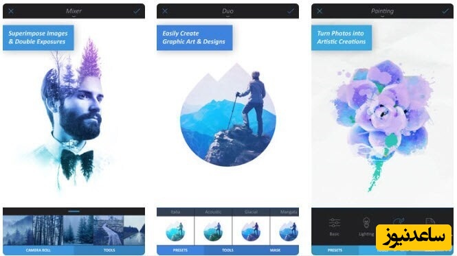 اگر بخواهید دسترسی بیشتری به تنظیمات هندسی و ویژگی هایی مانند ماسکینگ را داشته باشید این برنامه برای شما مناسب است.بعنوان یکی از بهترین برنامه های ویرایش عکس،محدوده گسترده ای از استایل های پیش فرض،نشت نوری،بافت ها،فریم ها،حاشیه گذاری و کولاژ(مخلوط رنگ ) طرح ها را درخود جای داده است.