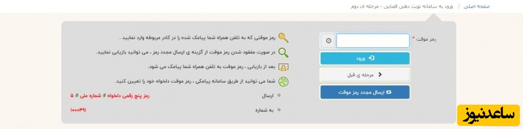 در این مرحله یک کد امنیتی از سوی سامانه ثنا به شماره تلفن ثبت شده شما در سامانه ثنا ارسال می گردد که باید آن را در کادر مربوطه وارد کرده و بدین صورت وارد صفحه اصلی نوبت دهی سایت عدل ایران خواهید شد. مانند تصویر: