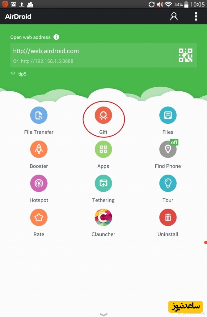 در گزینه دوم شما کلمه Bonus یا Gift را پیش روی خود می بینید.این گزینه برای استفاده در صورتی است که شما از نسخه رایگان برنامه استفاده می کنید.با اشتراک گذاری نمودن برنامه Airdroid می توانید تا مدتی معین از امکانات نسخه پیشرفته استفاده کنید.این گزینه هر از گاهی به بهانه های مختلف به شما امکانات اضافه می دهد.