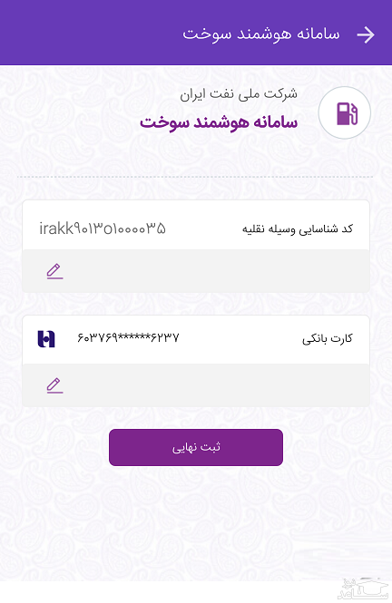 6- در نهایت اطلاعات وسیله نقلیه و کارت بانکی شما نمایش داده می شود و با انتخاب ثبت نهایی یک پیامک با این محتوا برای شما ارسال می شود: