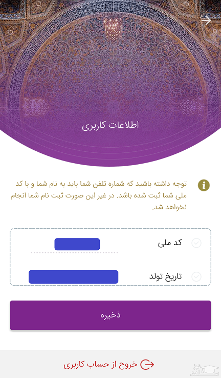 2- پس از نصب اپلیکیشن وارد برنامه شوید. در بدو لازم است شماره تلفن همراه خود را وارد کنید تا یک پیامک تایید به گوشی شما ارسال شود. سپس کد ملی و تاریخ تولدتان را وارد کنید و پس از نمایش اطلاعات در صورت صحت تایید کنید.
