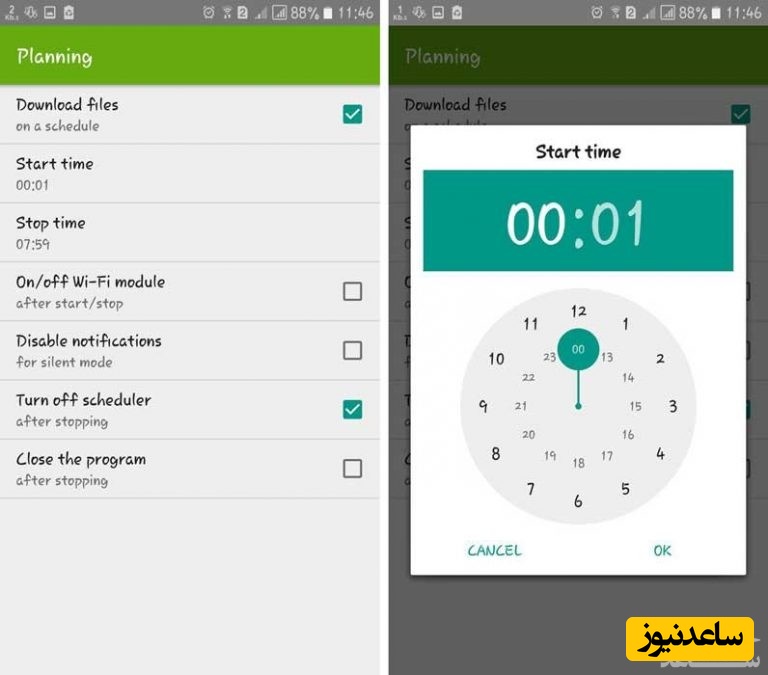سپس در بخش Start Time زمان آغاز دانلود و در بخش Stop Time زمان توقف دانلود را انتخاب کنید. در این قسمت قابلیت هایی دیگری نیز وجود دارد. به عنوان مثال با فعال سازی قابلیت On/off Wi-Fi Module، پس از اتمام دانلود اتصال به وای فای به صورت خودکار قطع می شود.