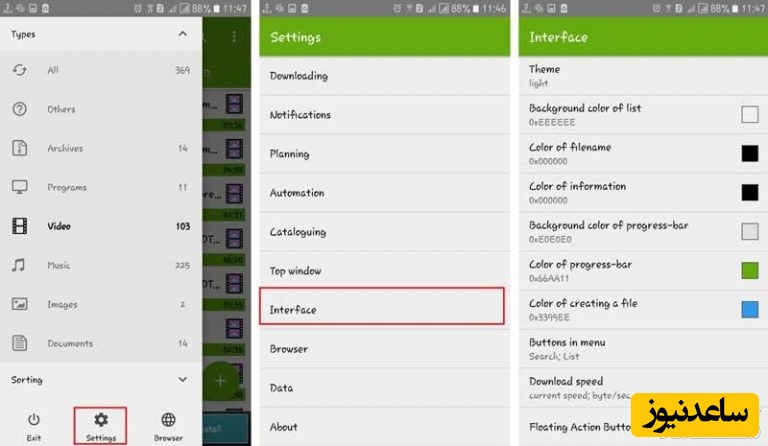 کاربران اپلیکیشن ADM می توانند محیط و تم برنامه را مطابق با سلیقه خود تغییر دهند. به منظور دسترسی به این قابلیت به بخش Settings در منوی برنامه مراجعه کرده و گزینه Interface را لمس نمایید. سپس می توانید در این بخش به شخصی سازی تم و محیط برنامه بپردازید.