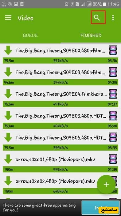 برنامه ADM از قابلیت کاربردی جستجو هم بهره می برد. بنابراین می توانید به راحتی با لمس آیکون به شکل ذره بین در گوشه بالا و سمت راست صفحه به جستجو فایل مورد نظر خود بپردازید.