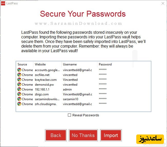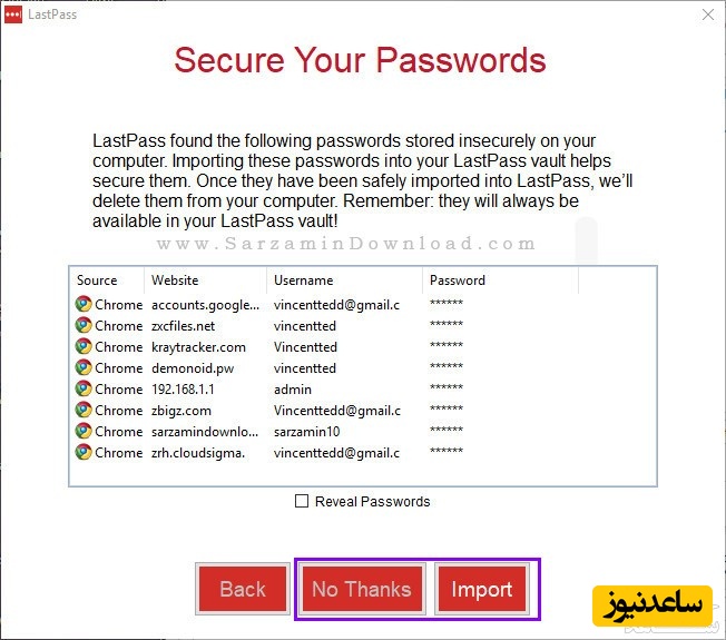 در این مرحله نرم افزار نام کاربری و رمز عبور هایی که در مرورگر هایتان وارد کرده اید و ذخیره شده اند را به نمایش میگذارد و از شما میخواهد که آن ها را به نرم افزار LastPass منتقل کنید تا امن شوند و دیگر کسی نتواند آن ها را از سیستم شما بردارد.