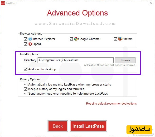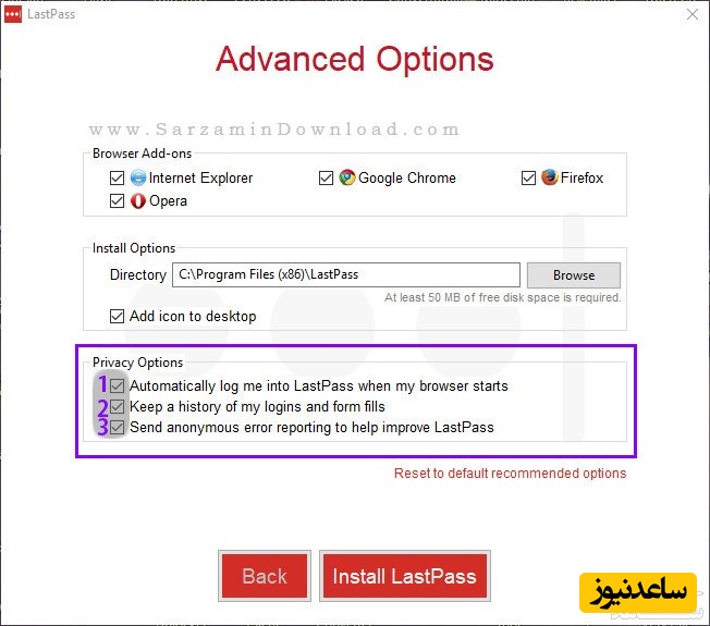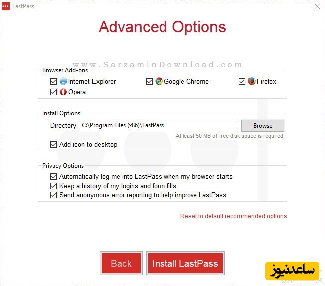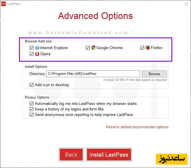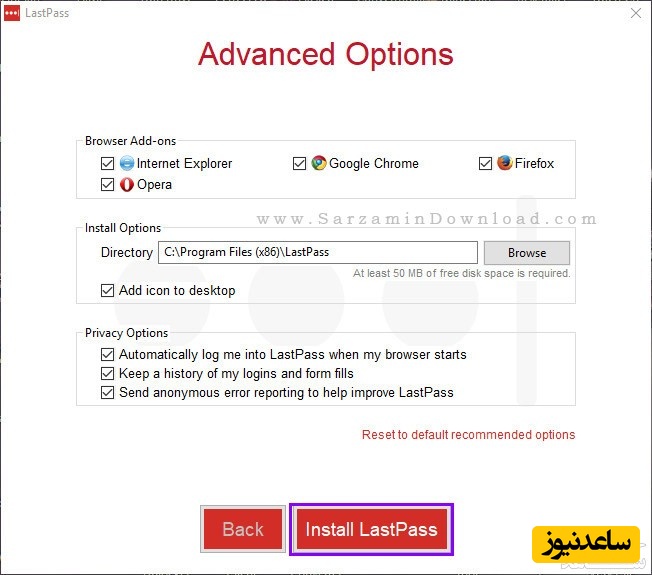 پس از انتخاب گزینه های مورد نظر “Install LastPass” ر ا کلیک کنید.