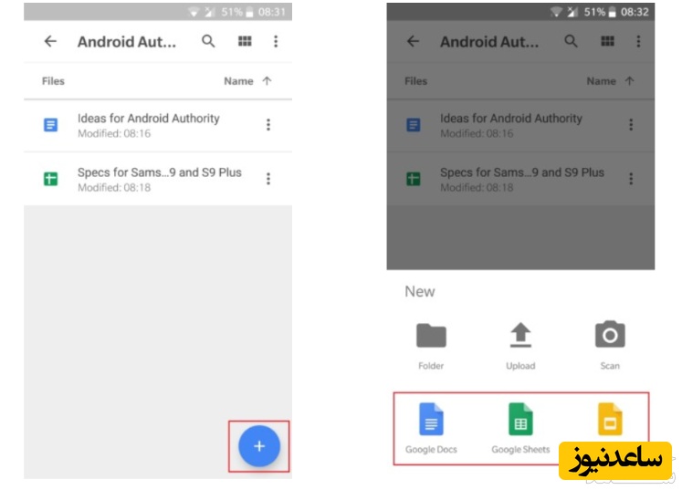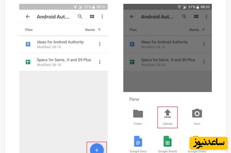 آپلود پرونده ها از تلفن همراه نیز بسیار ساده است. ابتدا برنامه درایو را باز نموده و روی علامت «+» در قسمت پایین و راست صفحه بزنید. سپس پرونده مورد نظر را برای آپلود انتخاب کنید.