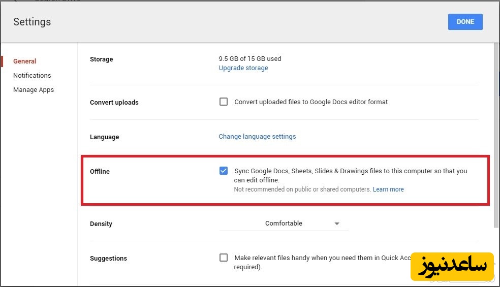 در ابتدا گزینه دسترسی آفلاین را برای هر دستگاه فعال کنید. برای فعال سازی این گزینه در رایانه، به منوی تنظیمات رفته و حالت «Offline» را انتخاب کنید (تصویر بالا). یادتان باشد افزونه Google Docs offline را نیز دانلود کنید. بدین ترتیب شما می توانید از طریق مرورگر کروم به وب سایت درایو راه یافته و اطلاعات خود را مشاهده و یا ویرایش نمایید. پرونده های موجود در پوشه درایو نیز با زدن کلیک، روی مرورگر کروم نمایان خواهند شد.