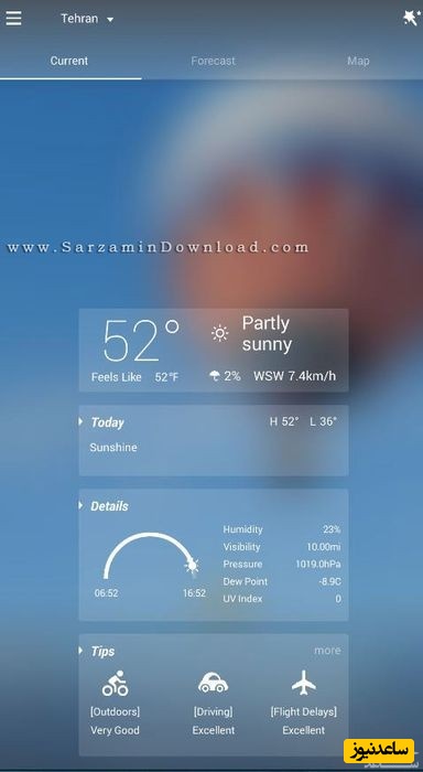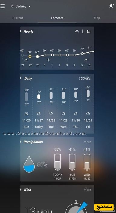 در این بخش می توانید اطلاعات آب و هوایی ساعتی، روزانه، سرعت باد و میزان رطوبت هوا را مشاهده کنید:
