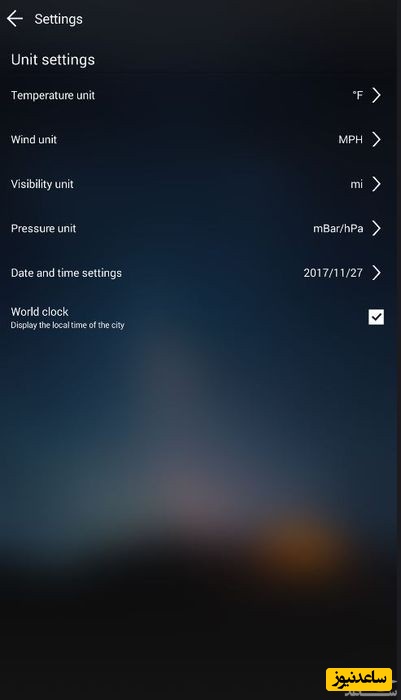 در این برگه می توانید واحد های دما، سرعت باد، دید و فشار را تغییر دهید: