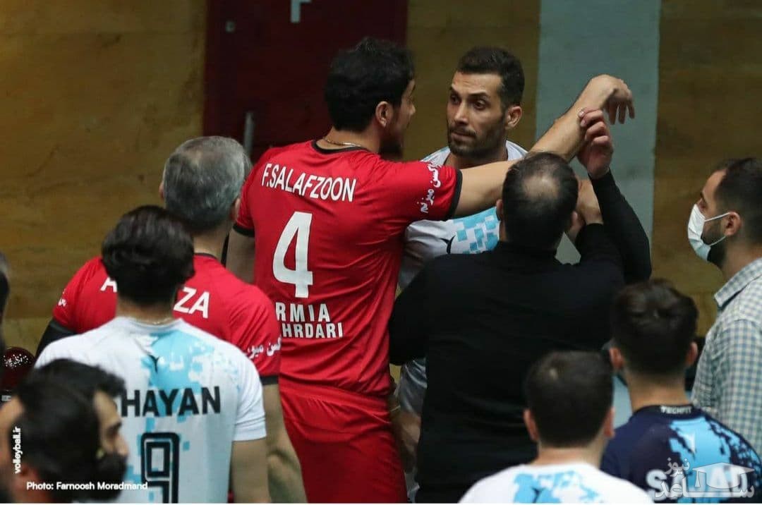 درگیری رفته رفته در حال اوج گرفتن بود که بازیکنان باتجربه دو تیم فضا را آرام کرده و نهایتاً هر طور که بود این جنجال عجیب به پایان رسید از طرفی آرمین تشکری و عادل غلامی دو ملی پوش سابق ایران محسوب می شوند که حتی در تیم ملی با یکدیگر هم تیمی نیز بوده اند و این مسئله باعث شد که درگیری بین آنها عجیب تر هم به نظر برسد. البته بعد از مسابقه بلافاصله فدراسیون والیبال به این اتفاق ورود و این دو بازیکن را تا اطلاع ثانوی محروم کرد.