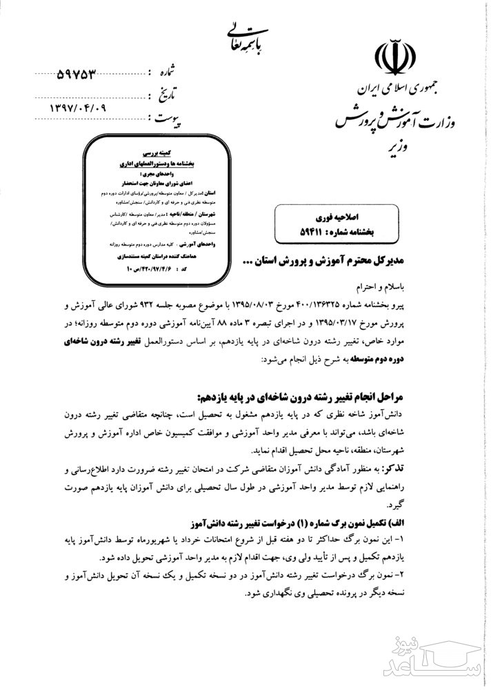 مطابق این دستورالعمل کلیه مراحل تغییر رشته درون شاخه ای در پایه یازدهم مشخص شده است.