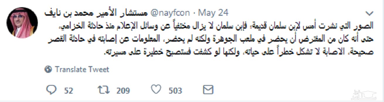 محمد بن نایف اعلام کرد تصاویری که دیروز از بن سلمان منتشر شده قدیمی است، بن سلمان از زمان حادثه منطقه الخزامی، هنوز در رسانه ها ظاهر نشده، قرار بود وی در ورزشگاه الجوهره حاضر شود اما حضور نیافت، اطلاعاتی که درباره زخمی شدن وی در حادثه مذکور منتشر شده صحیح است، زخم بن سلمان جان وی را تهدید نمی کند اما اگر زخمی شدن وی افشا شود، برای روند فعالیت وی خطرناک خواهد بود.