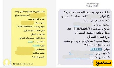 اس ام اس خلافی ماشین شامل شناسه قبض و شناسه پرداخت قبض جریمه برای شما ارسال خواهد شد.