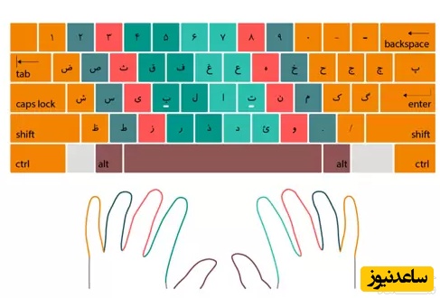 مرحله اول : مرحله اول برای یادگیری تایپ 10 انگشتی، یادگیری قواعد و اصول است. شما باید موقعیت هر انگشت بر حروف را یاد بگیرید تا بتوانید با تمرین و تکرار آن را به حافظه بسپارید. در قدم اول شما باید موقعیت دو حرف شاخص یعنی “ت” و “ب” را بشناسید، همانگونه که در کیبورد خود مشاهده میکنید این دو حرف دارای برجستگی است که این کار شما را آسان خواهد کرد. اگر انگشتان اشاره بر این حروف شاخص قرار بگیرد، سایر انگشتان کنار این دو حروف قرار میگیرد، انگشتان شست روی کلید space قرار خواهد گرفت. در تایپ 10 انگشتی هر انگشت مسئله زدن کلیدهای مشخصی است و همواره باید به یاد داشته باشید که کدام انگشت چه کلیدی را تایپ می کند. تمرین تایپ ده انگشتی به مرور این قوانین را در شما ایجاد می کند. شکل زیر موقعیت هر انگشت و حرف را نشان داده است: