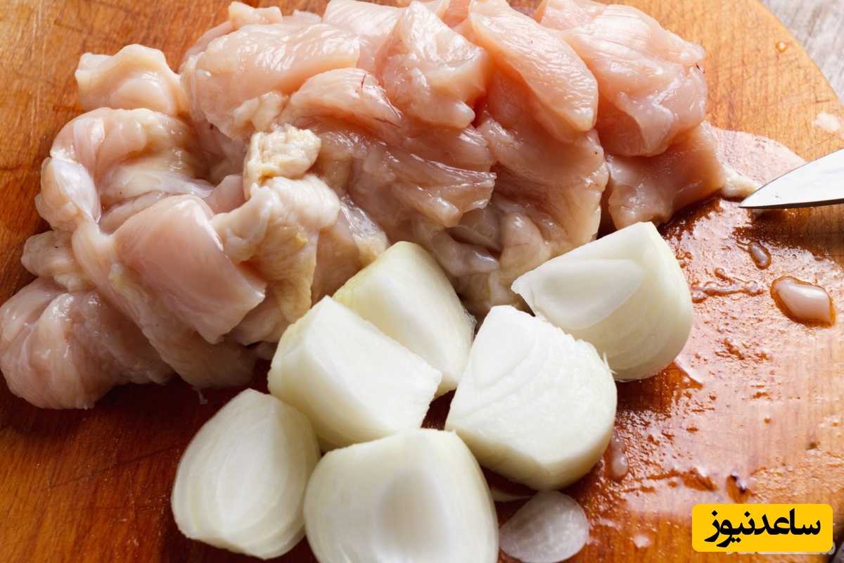 سیخ های کباب را در سینی گذاشته و پیاز را روی گوشت بریزید و در یخچال قرار دهید. گاهی سیخ ها را زیر و رو کنید تا دو طرف مرغ مزه دار شودو