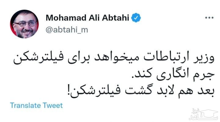 به گزارش پایگاه خبری تحلیلی ساعدنیوز به نقل از همشهری آنلاین، محمد علی ابطحی: وزیر ارتباطات می خواهد برای فیلترشکن جرم انگاری کند. بعد هم لابد گشت فیلترشکن!
