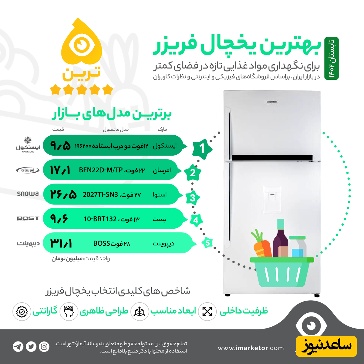 رسانه آیمارکتور بر اساس نظرات کاربران و پر فروشترین و ارزانترین محصولات در سایت های فروشگاه اینترنتی فهرست 10 تایی از بهترین یخچال فریزر را برای شما آماده کردهاست.