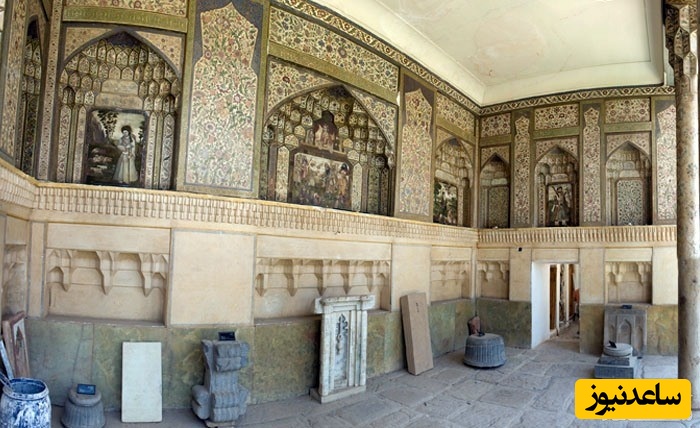 از دیدنیهای این عمارت تالاری است که سقف آن بر دو ستون بزرگ یکپارچه استوار شده و در طاقچههای بالایی آن، پنج مجلس روی گچ نقاشی شده و از شاهکارهای نقاشی دوران زندیه محسوب میشود. این مجموعه در سالهای 1336 و 1337 شمسی توسط نقاش و هنرمند محمد باقرجهان میری تعمیر و تجدید شد.