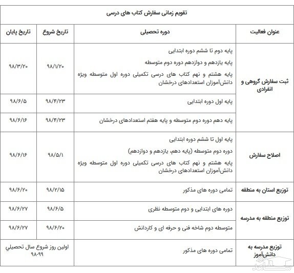 تقویم زمانی ثبت سفارش و توزیع کتاب های درسی سال تحصیلی ۹۹-۹۸ دوره های تحصیلی ابتدایی و متوسطه دوم (نظری، فنی و حرفه ای و کاردانش) و کتاب های درسی تکمیلی دوره اول متوسطه ویژه استعدادهای درخشان از طریق سامانه مربوط و برابر جدول تقویم زمانی زیر انجام می شود. لازم است مدارس ضمن اطلاع رسانی به دانش آموزان به شرح جدول تقویم زمانی زیر نسبت به ثبت سفارش کتاب های درسی سال تحصیلی ۹۹-۹۸ با فرض قبولی دانش آموز در سال تحصیلی جاری اقدام کنند. در صورت عدم موفقیت دانش آموز در پایه فعلی در زمان اصلاح سفارش امکان تغییر پایه وجود خواهد داشت: