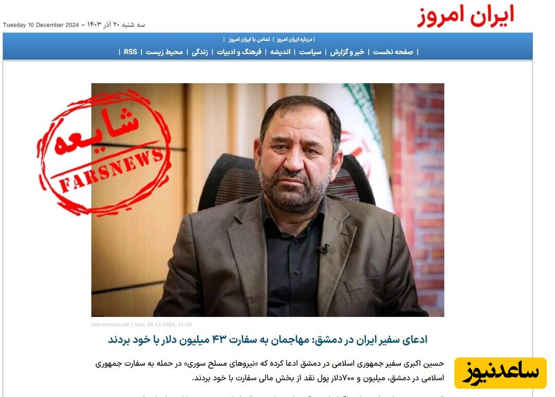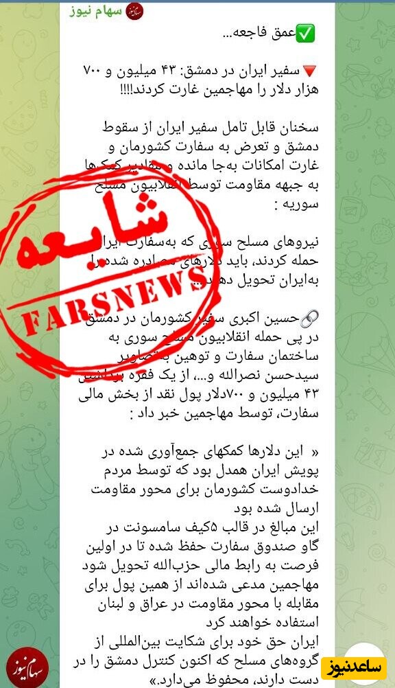 این عده مدعی هستند که حسین اکبری سفیر ایران در دمشق عنوان کرده که در پی حمله مسلحین به سفارت کشورمان 43 میلیون و 700 هزار دلار به غارت رفته است.