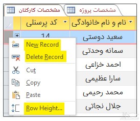 - برای حذف رکورد روی حاشیه سمت چپ. راست کلیک کرده وrecord Delete را انتخاب کنید.