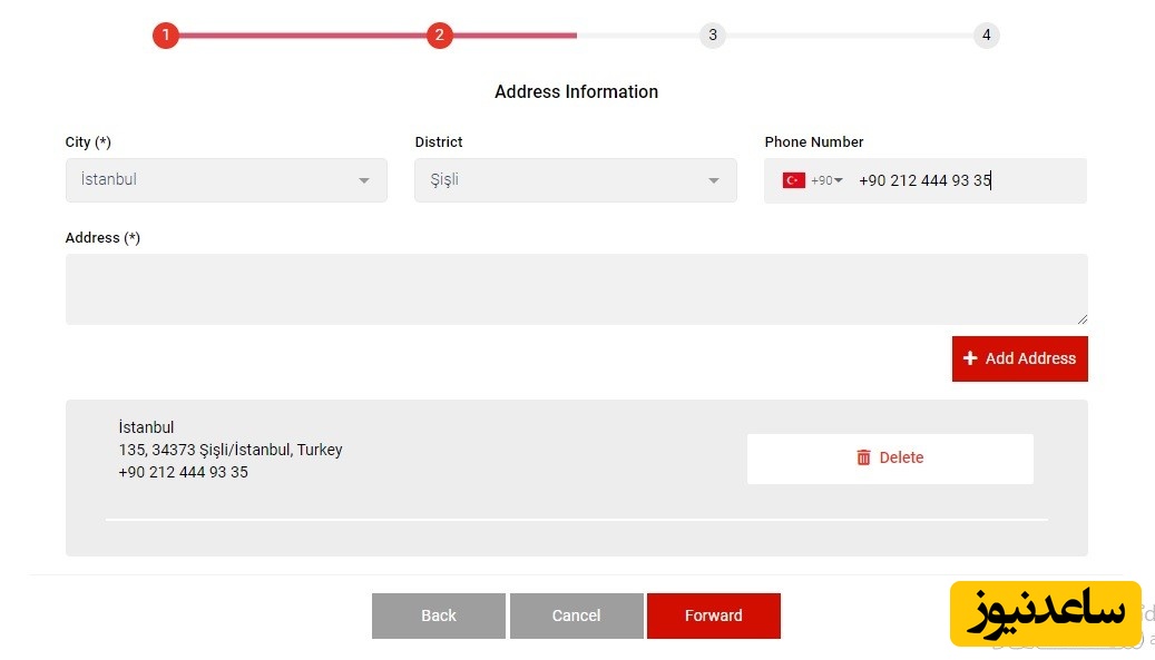 در این صفحه هم باید آدرس و شماره تلفن هتل یا مکان های استقرار خود را در ترکیه وارد کنید. به ترتیب شهر، محله، شماره تلفن و آدرس کامل را باید وارد کنید. دقت کنید که بعد از وارد کردن آدرس باید دکمه ADD را بزنید. در انتها با زدن دکمه Forward وارد مرحله بعد خواهید شد.