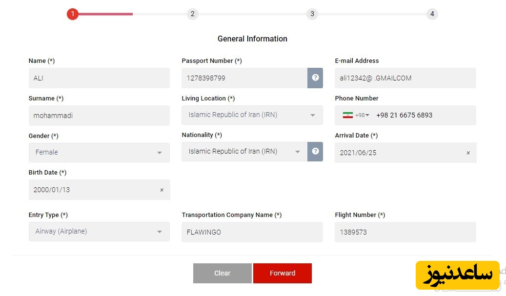 در این صفحه به ترتیب از سمت چپ به راست باید نام، شماره پاسپورت، آدرس ایمیل، نام خانوادگی (Surname)، محل زندگی (living location)، شماره تلفن خود در ایران یا محل زندگی خود در کشور مبدأ، جنسیت، ملیت، تاریخ ورود به ترکیه (arrival date)، تاریخ تولد، نوع ورود (Entry type) که می تواند با هواپیما، قطار و … باشد، نام آژانس مسافرتی خود (Transportation company name) و شماره پرواز خود برای ورود به ترکیه را وارد کنید. در انتها باید دکمه forward را برای ورود به صفحه بعد کلیک کنید.