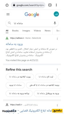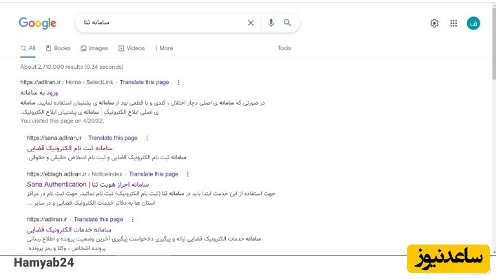 بعد از باز کردن مرورگر در گوگل سامانه ثنا را جستجو کنید، سپس روی سایت ابلاغ الکترونیک قضایی کلیک کنید تا وارد سامانه ثنا یا همان ابلاغ قوه قضاییه شوید.