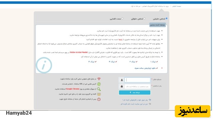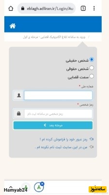 در این مرحله یکی از گزینه های حقیقی، حقوقی و یا قضایی را انتخاب کنید. سپس در فیلد اول شماره ملی و در فیلد دوم رمز عبور ثنا خود را وارد کنید. در نهایت روی گزینه مرحله بعد کلیک کنید.