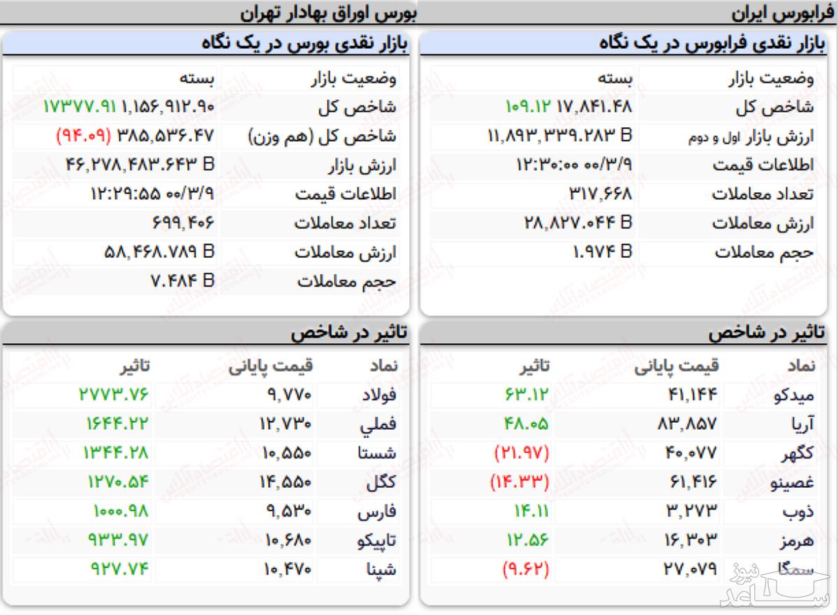 ارزش کل معاملات خرد بورس و فرابورس نیز در مجموع به بیش از چهار هزار و ۹۴۰میلیارد تومان رسید.