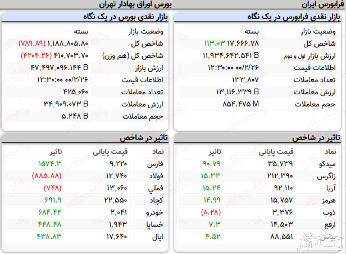 به گزارش سایت خبری ساعد نیوز به نقل از اقتصادآنلاین، در پایان معاملات امروز، شاخص کل بورس پس از افت ۷۹۰واحدی شاخص کل (۰.۰۷درصد) آن را در ارتفاع یک میلیون و ۱۸۸هزار واحدی قرارگرفت و همچنین شاخص کل هم وزن با کاهش یک درصدی مواجه شد.