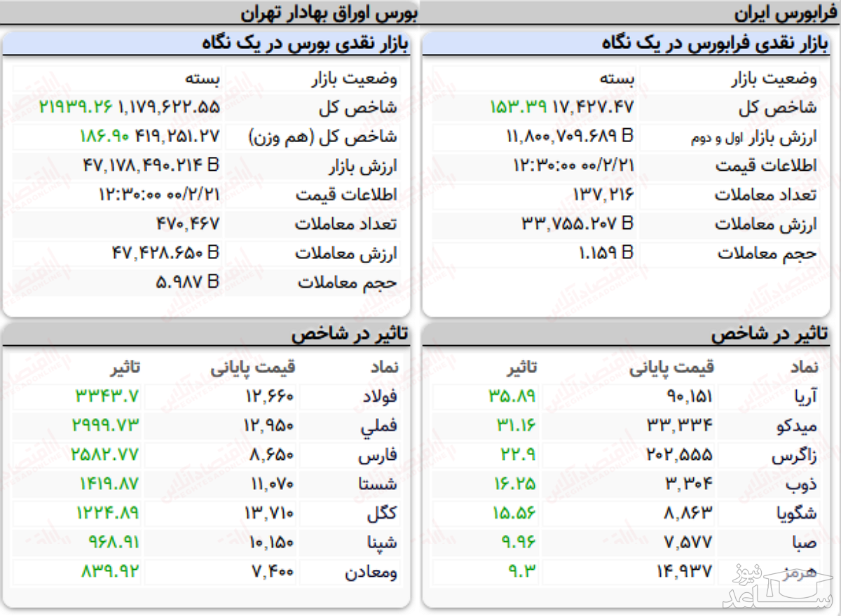 به گزارش سایت خبری ساعد نیوز به نقل از اقتصادآنلاین، در پایان معاملات امروز، شاخص کل بورس پس از رشد ۲۱هزار و ۹۳۹واحدی شاخص کل (۱.۹درصد) آن را در ارتفاع یک میلیون و ۱۷۹هزار واحدی قرارگرفت و همچنین شاخص کل هم وزن با افزایش۰.۰۴درصدی مواجه شد.