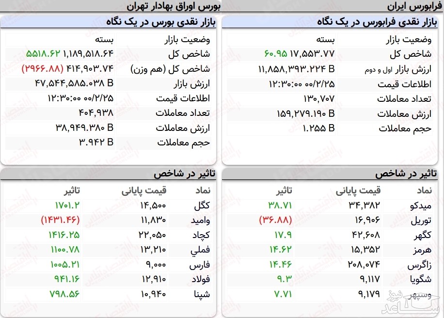 به گزارش سایت خبری ساعد نیوز به نقل از اقتصاد آنلاین، در پایان معاملات امروز، شاخص کل بورس پس از رشد پنج هزار و ۵۱۸ واحدی (۰.۵درصد) در ارتفاع یک میلیون و ۱۸۹هزار واحد قرار گرفت اما شاخص کل هم وزن با کاهش ۰.۷درصدی مواجه شد.