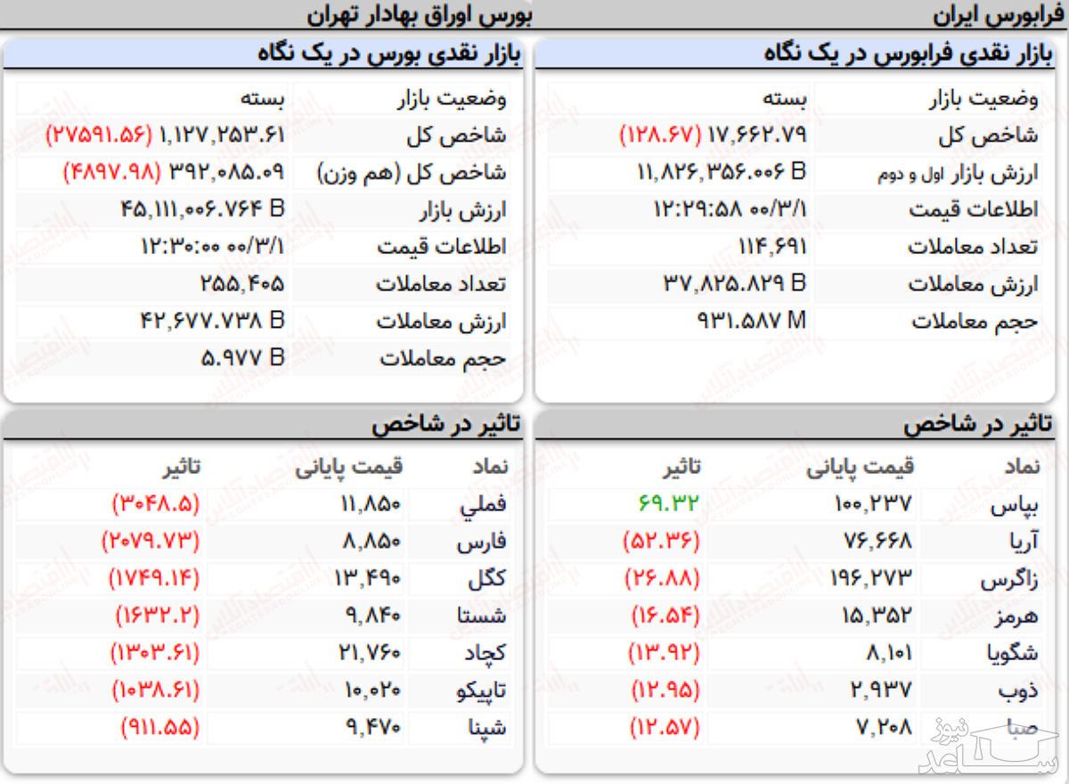 به گزارش سایت خبری ساعد نیوز به نقل از اقتصادآنلاین، در پایان معاملات امروز، شاخص کل بورس پس از افت ۲۷هزار و ۵۹۱واحدی شاخص کل (۲.۴درصد) آن را در ارتفاع یک میلیون و ۱۲۷هزار واحدی قرارگرفت و همچنین شاخص کل هم وزن با کاهش ۱.۲درصدی مواجه شد.