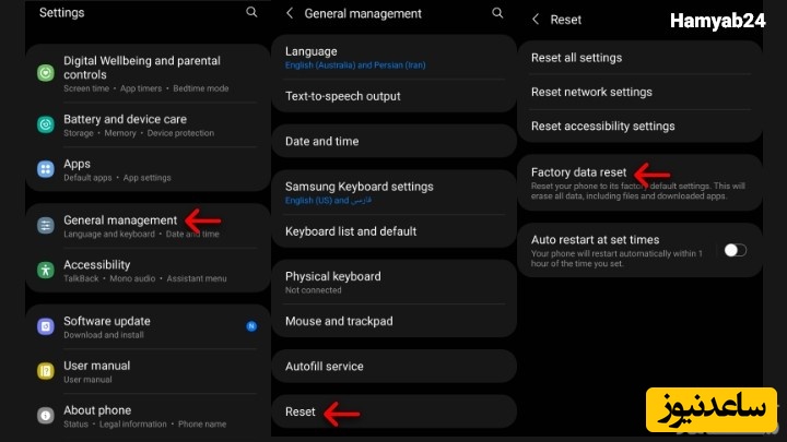 همانطور که می دانید با بازگردانی گوشی تان به تنظیمات اولیه کارخانه، تمامی فایل ها و اطلاعات گوشی شما پاک می شود. بنابراین اگر به فایل هایی که در گوشی دارید نیازی ندارید، ریست فکتوری بهترین گزینه می تواند برای شما باشد.به منظور ریست فکتوری گوشی سامسونگ مسیر زیر را دنبال کنید: