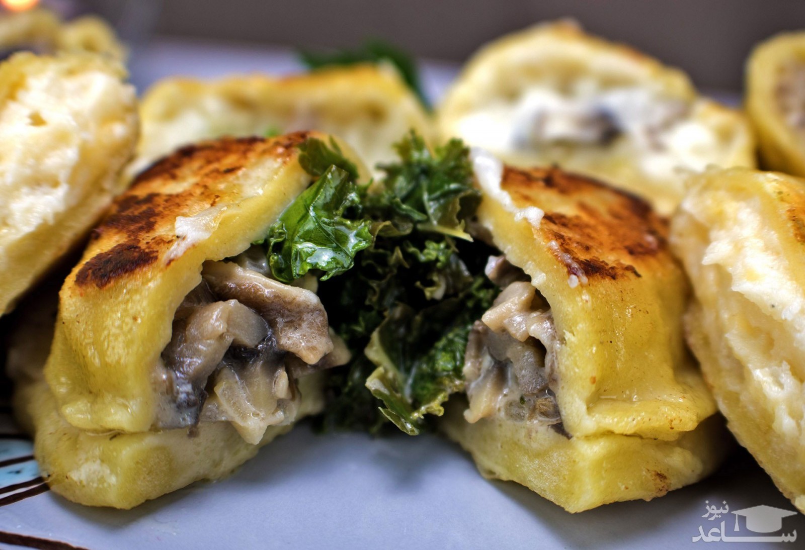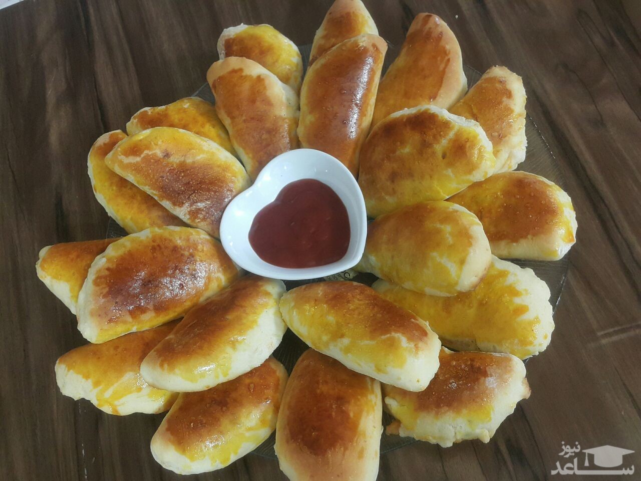 ۲. مواد میانی را روی مرکز خمیر بریزید بطوری که تنها نیمی از خمیر را بپوشاند. حدود ۷ سانت از لبه های خمیر را خالی بگذارید.