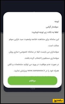 بعد از انتخاب گزینه مشاهده دارایی سهام عدالت، سهامداران وارد صفحه زیر می شوند که در این قسمت اطلاعات و نکاتی ذکر شده که می بایست بعد از مطالعه دقیق و کامل آن ها روی گزینه «متوجه شدم» کلیک کنید.
