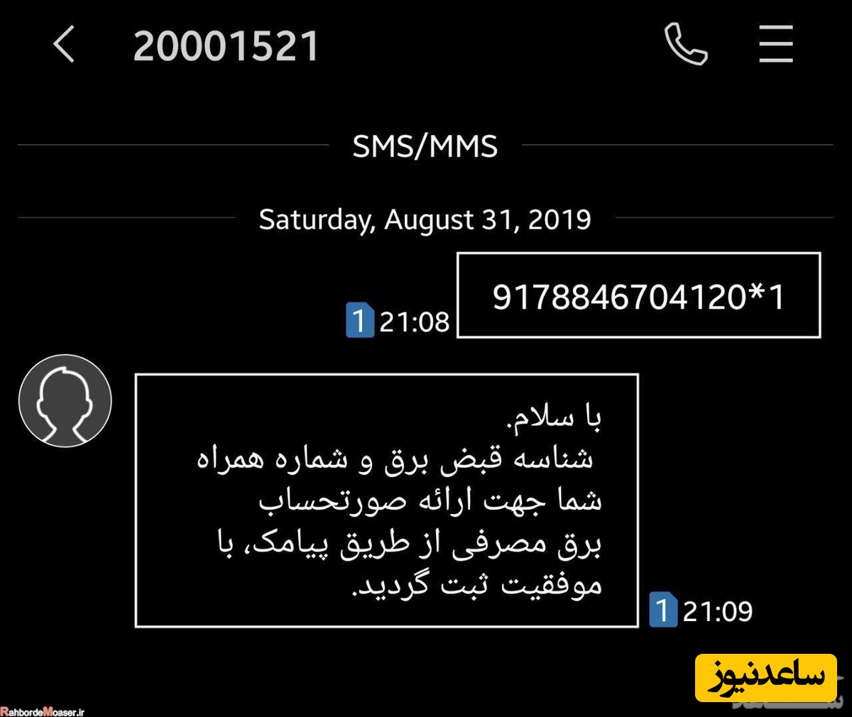 چند ثانیه پس از ارسال پیام پیامی با این محتوا دریافت می کنید: «با سلام. شناسه قبض برق و شماره همراه شما جهت ارائه صورتحساب برق مصرفی از طریق پیامک، با موفقیت ثبت گردید.»