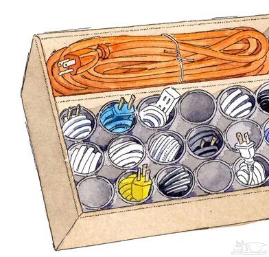 لوله های مقوایی داخل دستمال توالت را دور نریزید. آنها را به طور مرتب درون یک جعبه کنار هم بچینید و سیم، کابل و شارژرهای اضافه را به طور مرتب حلقه کنید و درون آنها قرار دهید. به این ترتیب، از درهم پیچیده شدن سیم ها جلوگیری خواهید کرد.