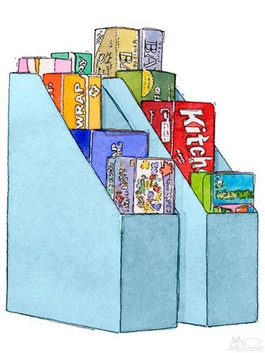 اگر جای روزنامه و مجله در خانه دارید، از آن به صورت عمودی به عنوان مکانی برای قرار دادن کیسه های فریزر، پلاستیک و فویل الومینیومی در آشپزخانه استفاده کنید.