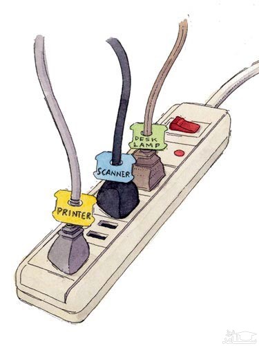 برای تشخیص بهتر سیم های برقی که داخل سه راهی قرار دارند، می توانید برچسب های پلاستیکی از داخل سیم ها عبور دهید و نام وسیله ای که به آن تعلق دارد را بنویسید. با این خلاقیت ساده، دیگر به اشتباه سیم وسیله ها را به اشتباه از پریز خارج نمی کنید.