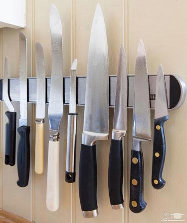 چاقوهای بزرگ را از داخل کشو در بیاورید و داخل جا چاقویی های رومیزی یا دیواری قرار دهید. برای این منظور می توانید از تخته های آهن ربایی استفاده کنید و چاقوها را به آن بچسبانید.