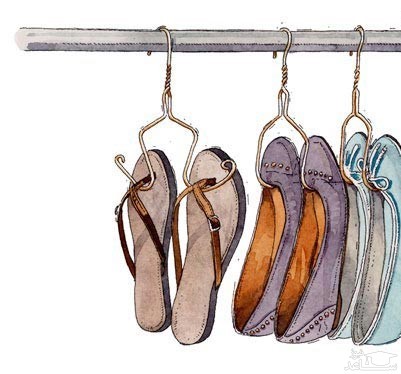 برای ساختن چوب رختی برای کفش های خود باید میله پایین چوب رختی لباس را با انبردست قطع کنید، آن را به دو طرف به بیرون یا به طور موازی به داخل خم کنید و آن را به شکل چنگک در آورید. برای دمپایی و صندل باید چنگک های این چوب رختی را به بیرون خم کنید و برای کفش های معمولی دو بازوی آن را به طور موازی به طرف داخل خم کنید. با این خلاقیت جالب، می توانید کفش ها و صندل هایتان را از کمد آویزان کنید.