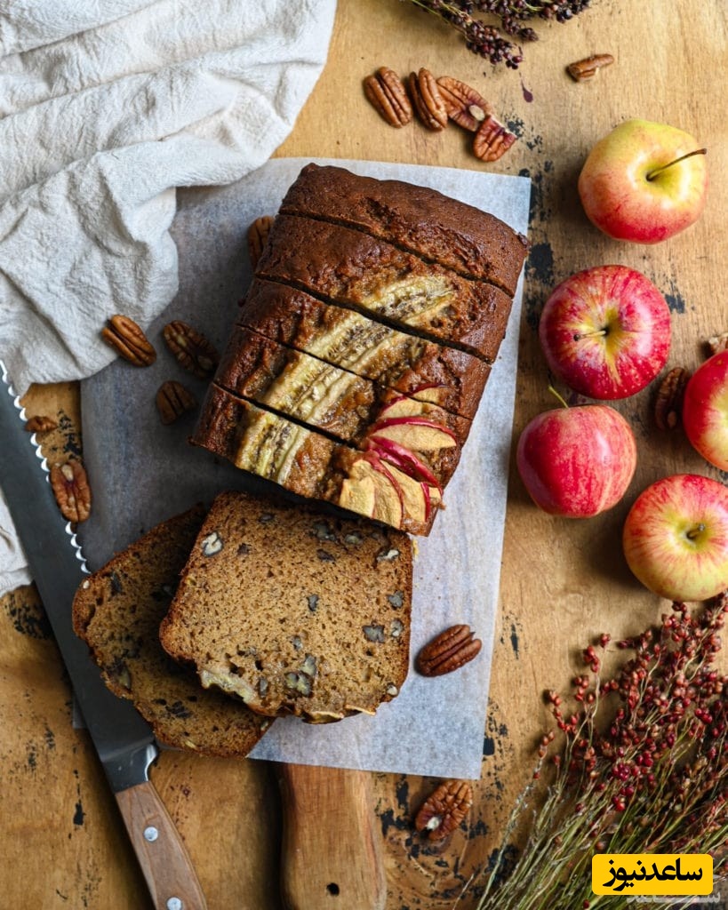 موز را افزوده و مجددا بزنید تا ترکیب یک دست شود(30ثانیه کافیست). مخلوط آرد را طی دو مرحله اضافه و با لیسک به آرامی ترکیب کنید. نیمی از مخلوط را درون قالب ریخته و سیب ها را روی آن بچینید مابقی مواد را بریزید و سطح را صاف کنید. قالب را برای مدت تقریبی 50 دقیقه درون فر گرم شده قرار دهید. بعد از سپری شدن این مدت کیک را تست کنید و بعد از پخت کامل از فر خارج کنید و پس از خنک شدن با پودر قند یا هرچیز دیگری که دوست دارید پوشش دهید.