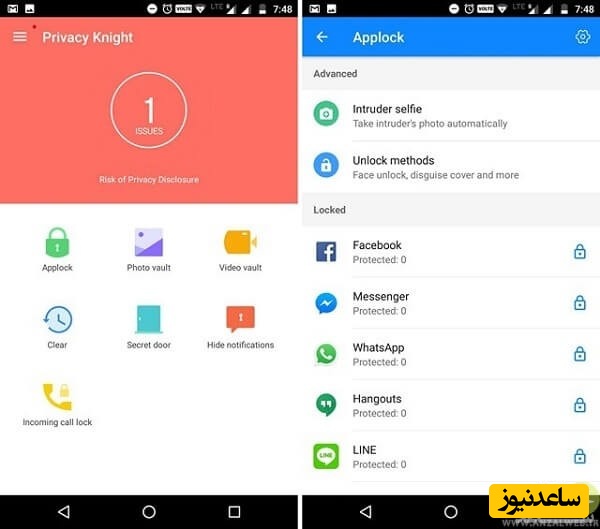 Privacy Knight ، رمز گذاری برنامه های اندروید با پترن ، عدد و اثر انگشت: Privacy Knight که طراحی گروه علی بابا است، اپلیکیشنی رایگان است که با استفاده از آن می توانید به روش های مختلف اپلیکیشن های گوشی را قفل کنید. روش هایی مثل الگو (پترن)، رمز عددی، اثر انگشت و یا استفاده از تصویر صورت. هم چنین قادرخواهید بود تماس های وروردی، حذف برنامه ها، مخفی کردن نوتیفیکیشن های برنامه هایی مثل واتس اپ را نیز قفل کنید. یک ویژگی جالب این اپلیکیشن، عکس گرفتن از کسانی است که پسورد اشتباه را وارد کرده اند، است!