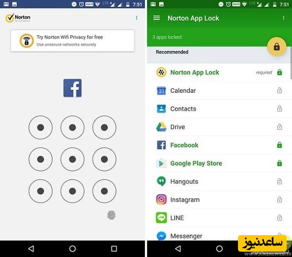 برنامه app lock برای پسورد گذاشتن روی گالری و برنامه های اندروید: احتمالا اسم نورتون آنتی ویروس مشهور به گوش شما خورده است. این شرکت یک برنامه ساده برای قفل گذاشتن روی اندروید ارائه کرده است، که می تواند گزینه خوبی برای استفاده رایگان باشد. با استفاده از Norton App Lock میتوان برنامه ها را با الگو، رمز عددی و یا اثر انگشت قفل کرد. از گزینه های موجود دیگر این برنامه، جلوگیری از حذف برنامه ها، تنطیم کردن ایمیل برای ریکاوری، عکس گرفتن از کسانی که سه بار رمز را اشتباه وارد کرده اند، می توان اشاره کرد.